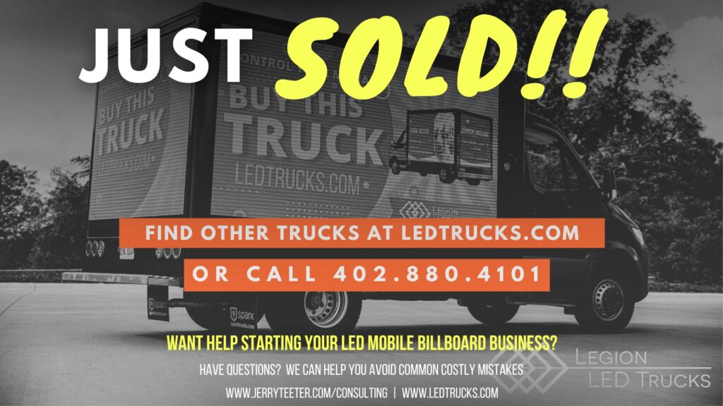 Grab the book written by industry veteran, Jerry Teeter “How to Start a Mobile Digital Billboard Business Without Losing $100K” – it’s available on Amazon for $19.95, or grab a FREE author-signed copy with faster shipping at www.LEDtrucks.com/freebook …just pay $9.95 s/h.